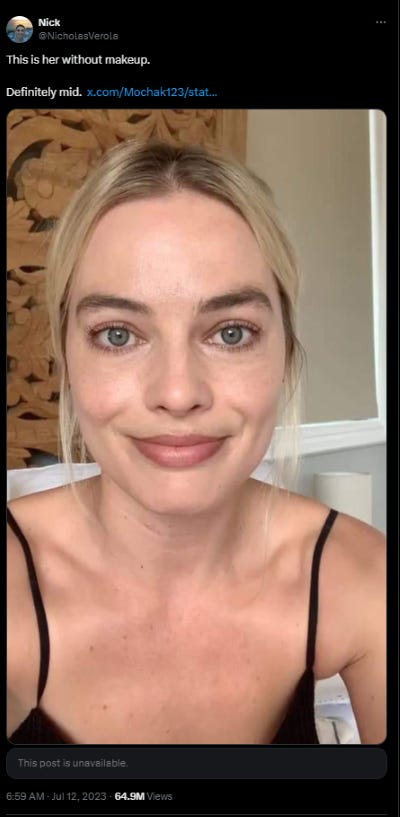 In an old X post, which had got 64.9 million views (is now removed), a user named @NicholasVerola said, “This is her without makeup. Definitely mid,” He went on to add an image proving it. A user named @bizlet7 said, “She is a hard 7. You used to find a Margot Robbie in every Blockbuster Video in 1995.” while another added, “I wonder if women are freaking out bc if Margot Robbie used to be a 9 and now she is mid at 33, that means we will be like 2 at 33.”